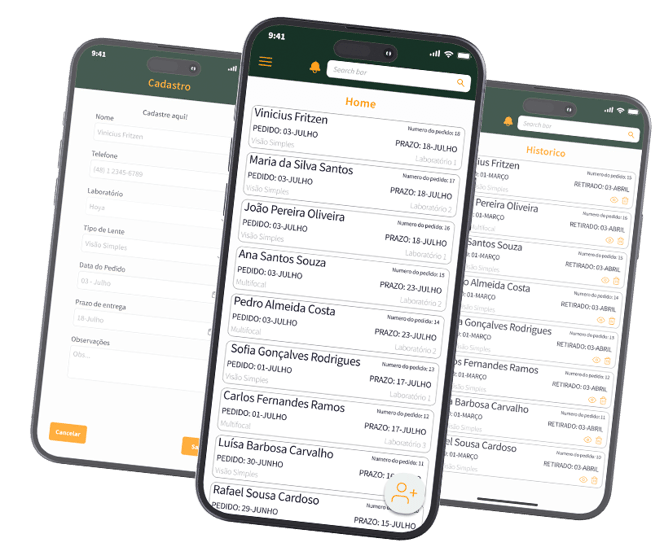 O aplicativo revoluciona a gestão interna de óticas, proporcionando uma interface intuitiva para o gerenciamento eficiente do ciclo de vida dos óculos, desde a produção até a entrega.